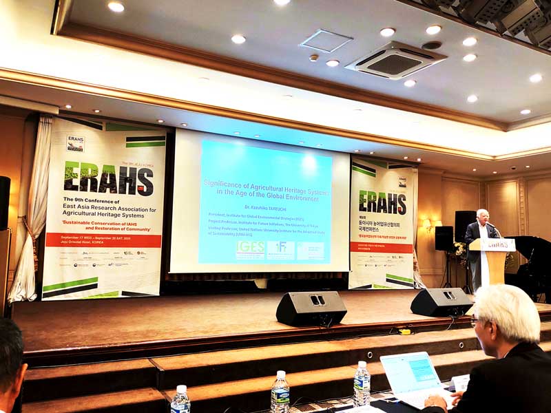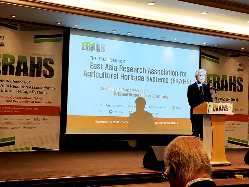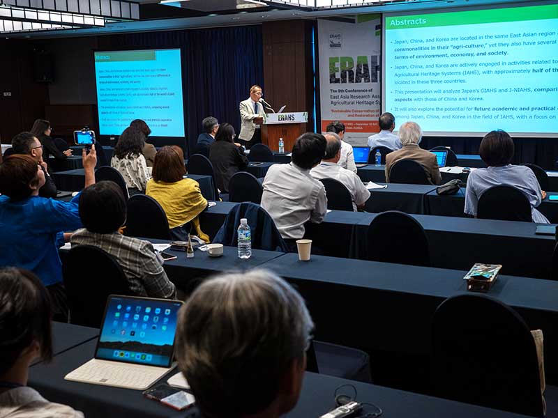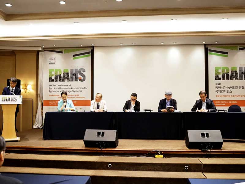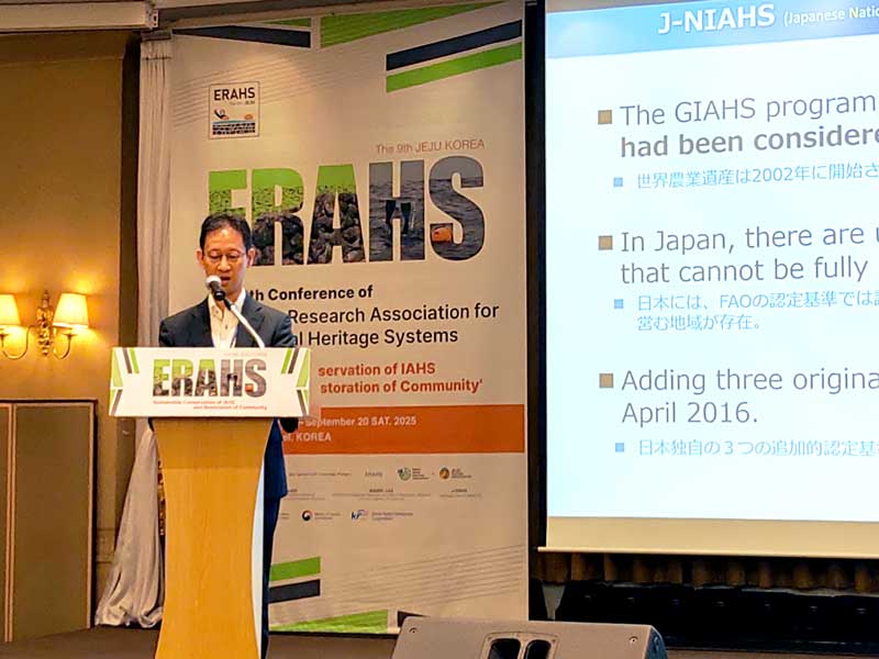 9月18日から20日まで韓国の済州島で第9回東アジア農業遺産学会(ERAHS)が「農業遺産の持続的な保全とコミュニティの回復」をテーマに開催され、日中韓やFAOの農業遺産関係者約250名が参加し、交流を深めました。日本からは農林水産省農村環境対策室の吉見友弘室長をはじめ農業遺産認定地域の関係者、大学の研究者ら約40名、中国からも約40名が参加しました。