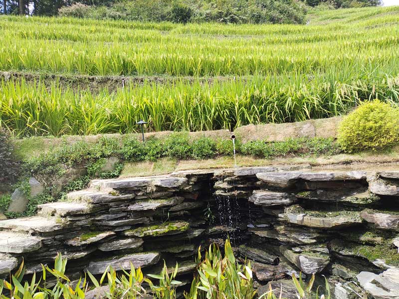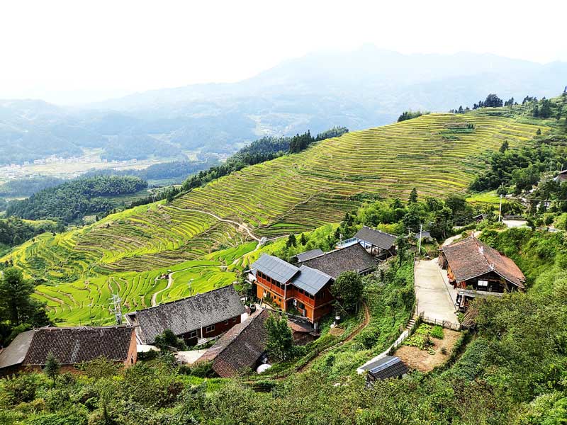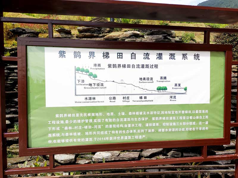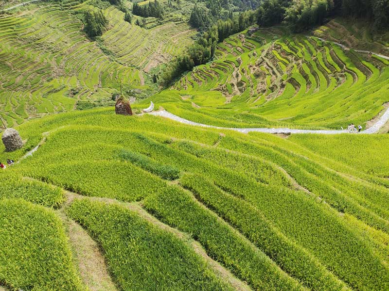 さて話を戻して、この紫鵲界の棚田は、2018年に世界農業遺産に認定された「中国の南部山岳丘陵地域における棚田システム」の一部です。システム全体は、湖南省・江西省・広西チワン族自治区などに広がる伝統的な水稲農業の地域で、漢族や瑤族、苗族など多様な民族が、山の斜面を利用して水源を巧みに管理し、自然と共生する形で稲作を続けています。その中でも紫鵲界棚田は代表的なエリアで、標高差数百メートルにわたり約3300ヘクタールの棚田が連なっています。独特の水管理技術や輪作体系、民族文化と景観が一体となっており、街に近い一部が観光地化されて、入場料をとって公開されています。