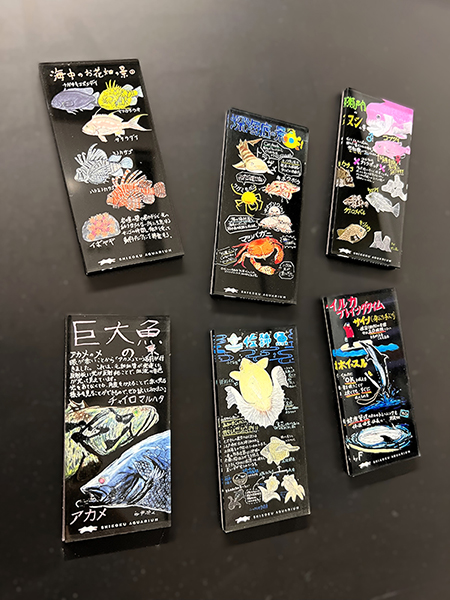 黒板マグネットに関して、現時点で販売されているのは6種類。イルカのプログラムでトレーナーが示すサインやホイッスルの役割を紹介した「イルカプレイングタイム」、縄張り意識が強く釣り人や漁師から「主(ぬし)」と呼ばれる魚を紹介した「瀬戸内のヌシの景」、ダイバーから“海中のお花畑”と呼ばれるサンゴが群生する宇和島の海を紹介した「海中のお花畑の景」、釣り人のあこがれで汽水域を好む巨大魚・アカメを紹介した「巨大魚の景」、水深が深い室戸岬東側に生息する深海魚を紹介した「深海底の景」、そして「日本三大地金魚」の一品種であり、高知県の天然記念物に指定されているトサキンを紹介した「土佐錦魚」です。黒板Tシャツは「イルカプレイングタイム」「瀬戸内のヌシの景」「土佐錦魚」の3種類です。