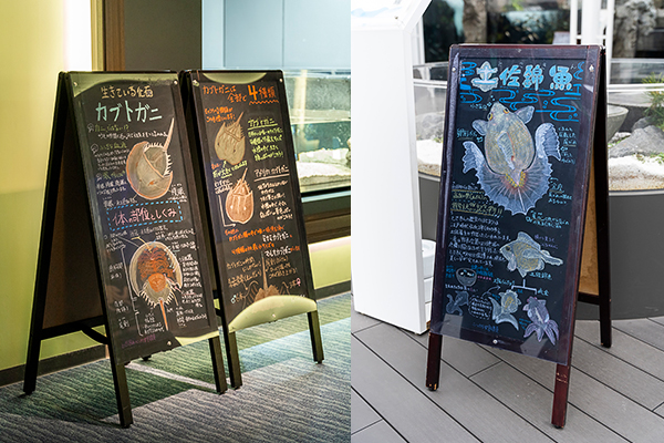 四国水族館の黒板解説は、コロナ禍において来館者と対面でのコミュニケーションが難しくなった時期に、生きものたちの情報を伝える新たな手段として設置されたのが始まりです。